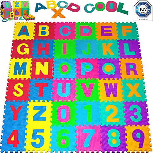 Set bestehend aus 26 Buchstaben-Matten (A-Z) und 10 Zahlen-Matten von 0-9 (86 Einzelteile)Der 1,92mx1,92m; 3,68m² große Kinderteppich vielfältig einsetzbar als Teppich, Spielfläche, Sitzpolster etc.